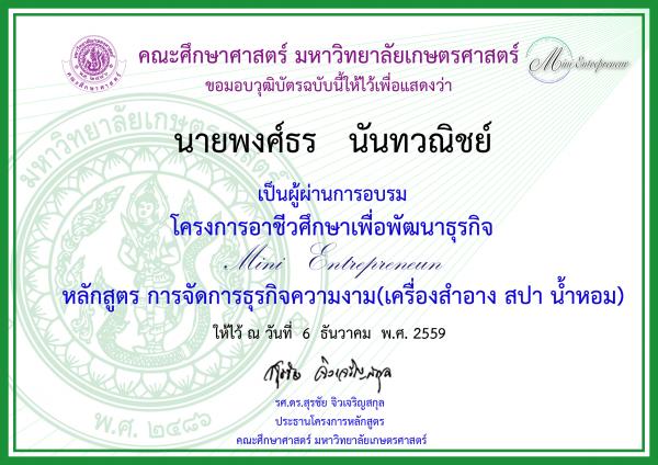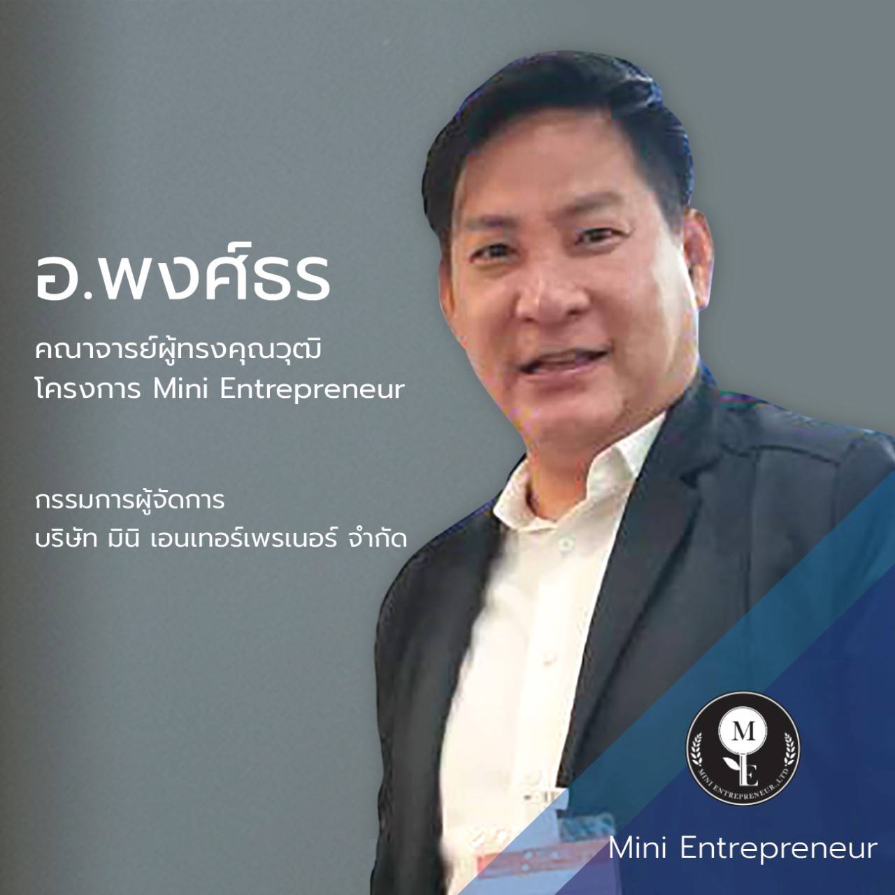 ผู้ทรงคุณวุฒินายพงศ์ธร นันทวณิชย์ โครงการ Mini Entrepreneur ชื่อ-นามสกุล นายพงศ์ธร นันทวณิชย์ ตำแหน่ง : - กรรมการผู้จัดการ บริษัท มินิ เอนเทอร์เพรเนอร์ จำกัด สถานที่ทำงาน: สถาบันฝึกอบรม สำหรับ เจ้าของธุรกิจ Mini Mini Entrepreneur อาคาร วิทยบริการ มหาวิทยาลัยเกษตรศาสตร์ บางเขน ข้อมูลติดต่อ Tel.086 533 0866 line id: Aj.pongthorn ปัจจุบัน : - ผู้จัดการโครงการ Mini Entrepreneur - กรรมการสมาคมธุรกิจร้านอาหาร - กรรมการสมาคมธุรกิจอาหาร จังหวัดนนทบุรี ตำแหน่งที่ปรึกษา - คณะกรรมการและที่ปรึกษา กรรมมาธิการคุ้มครองผูบริโภค สภาผู้แทนราษฎร - คณะกรรมมาธิการและที่ปรึกษา การวางแผนนโยบายการช่วยเหลือผู้มีผลกระทบการแพร่ระบาดของโรคติดเชื้อโคโรน่า 2019-2020(ระลอก3)สภาผู้แทนราษฎร - คณะกรรมมาธิการและที่ปรึกษา พาณิชย์ลดราคาช่วยประชาชน Lot 11 สำนักงานปลัดกระทรวงพาณิชย์ - คณะกรรมมาธิการและที่ปรึกษา วางแนวทางปฎิษัติที่ดีของครัวมาตรฐาน(Good Kichen Practice)สถาบันอาหาร - ที่ปรึกษา ธุรกิจอาหารและภัตตาคาร - ที่ปรึกษา ธุรกิจความงามฯ(เวชสำอางค เครื่องสำอาง สปา น้ำหอม) - ที่ปรึกษา THE DOOR - วิทยากรบรรยายพิเศษ สถาบัน มหาวิทยาลัยเกษตร์ศาสตร์ - วิทยากรบรรยายพิเศษ สถาบัน มหาวิทยาลัยหัวเฉียวเฉลิมพระเกียรติ - วิทยากรบรรยายพิเศษ กรมการค้าภายใน กระทรวงพาณิชย์ - วิทยากรบรรยายพิเศษ กรมพัฒนาธุรกิจการค้า กระทรวงพาณิชย์ - ที่ปรึกษาทั้งภาครัฐและภาคเอกชน อีกมากมาย... สายงานที่รับผิดชอบ 1.ที่ปรึกษาด้านบริหารการศึกษา 2.ผู้บริหารระดับสูง ฝ่ายบริหารการศึกษา 3.ผู้ช่วยผู้อำนวยการฝ่ายบริหารการศึกษา/ การฝึกอบรมและสายงานอื่นๆ ที่สนับสนุนการศึกษา 4.การจัดอบรม/ สัมมนา/ การประชุมวิชาการ/ การฝึกอบรมอาชีพ 5.คณะกรรมมาธิการและที่ปรึกษาของภาครัฐและภาคเอกชน การศึกษา - ปริญญาโทบริหารธุรกิจมหาบัญฑิต สาขาวิชา การจัดการธุรกิจอาหารและภัตตาคาร(เกียรตินิยมอันดับ1) สถาบัน รัชต์ภาคย์ - อนุปริญญา สาขาวิชา การจัดการและการประเมินโครงการ มหาวิทยาลัยราชภัฏสวนดุสิต - ปริญญาตรีมนุษยศาสตร์บัณฑิต สาขาวิชา สื่อสารมวลชน มหาวิทยาลัยรามคำแหง - ประกาศนียบัตรวิชาชีพชั้นสูง ผลงานที่ผ่านมา *ผู้จัดทำโครงการอาชีวะศึกษาเพื่อการพัฒนาธุรกิจ Mini Entrepreneur ภาควิชาอาชีวศึกษา คณะศึกษาศาตร์ มหาวิทยาลัยเกษตรศาสตร์ หลักสูตร การจัดการและการพัฒนาธุรกิจฯ -หลักสูตร การจัดการธุรกิจอาหารและภัตตาคาร -หลักสูตร การจัดการธุรกิจความงามฯ(เครื่องสำอาง สปา น้ำหอม) -หลักสูตร การจัดการธุรกิจแฟร์ชั่นเสื้อผ้า ผลงานที่ผ่านมา *พ.ศ.2557–2558 ที่ปรึกษาด้านบริหารการศึกษาทางไกล(การศึกษาทางไกลผ่านระบบอินเตอร์เน็ต) ในระดับ 
